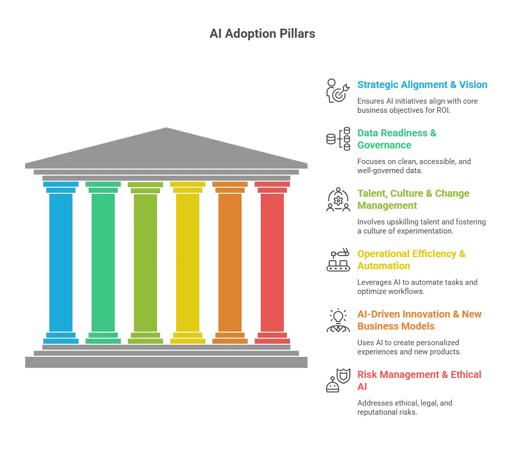 Successful AI integration is not just a technological feat—it requires a holistic approach built on several interdependent pillars. Addressing these foundational elements is critical for moving beyond isolated pilot projects to scalable, impactful, and sustainable AI adoption.