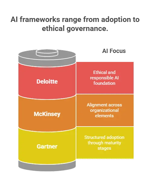 Philosophy and Principles: Deloitte's approach is distinct in its primary focus: governance and ethics. Rather than a phased adoption roadmap, their framework centers on building a robust, ethical, and responsible AI foundation. The core principle is that trust is a prerequisite for scaling AI, and an organization must proactively manage the associated risks.