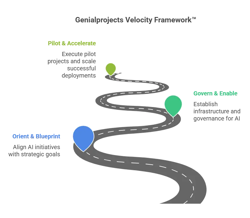 The Genialprojects Velocity Framework™ is designed to do just that, offering a structured, end-to-end approach that translates strategic intent into tangible business value. It is the roadmap for organizations seeking to navigate the hype and truly embed AI into their core operations, not just to survive, but to thrive in the new, intelligent economy.