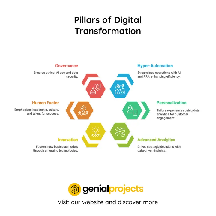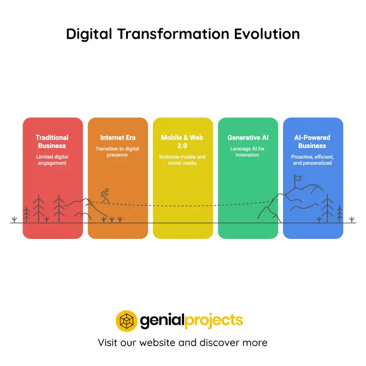 This article delves into the various phases of digital transformation, tracing its historical evolution, and pinpointing the current trend of generative AI. We will outline key milestones, core pillars that define successful transformations, enabling technologies, and established frameworks. Additionally, we will provide a structured approach developed by Genialprojects to facilitate robust digital transformation initiatives. By equipping decision-makers with these insights, we aim to inspire and guide them on their unique journeys toward innovation-driven success.